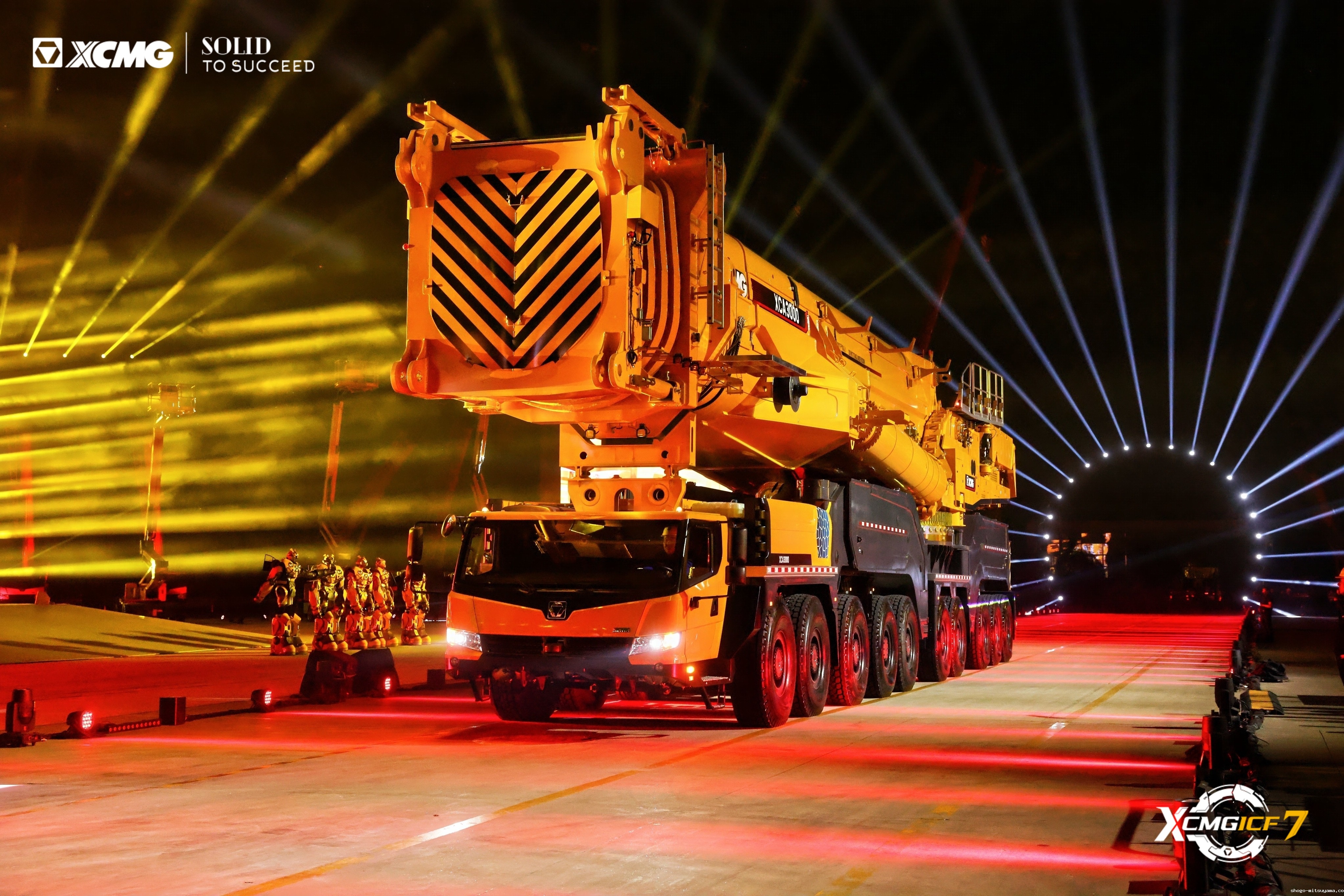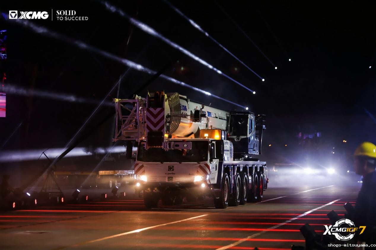 16台起重机列阵如虹,XCA900L8—1全地面起重机领衔,轮式与履带产品组成“钢铁舰队”。车队驶过观礼台,客户纷纷举起手机定格画面,客商高呼:“Amazing!”鸣笛声中,设备驶向全球,灯光在夜幕中汇成“时光隧道”,照亮远征之路。