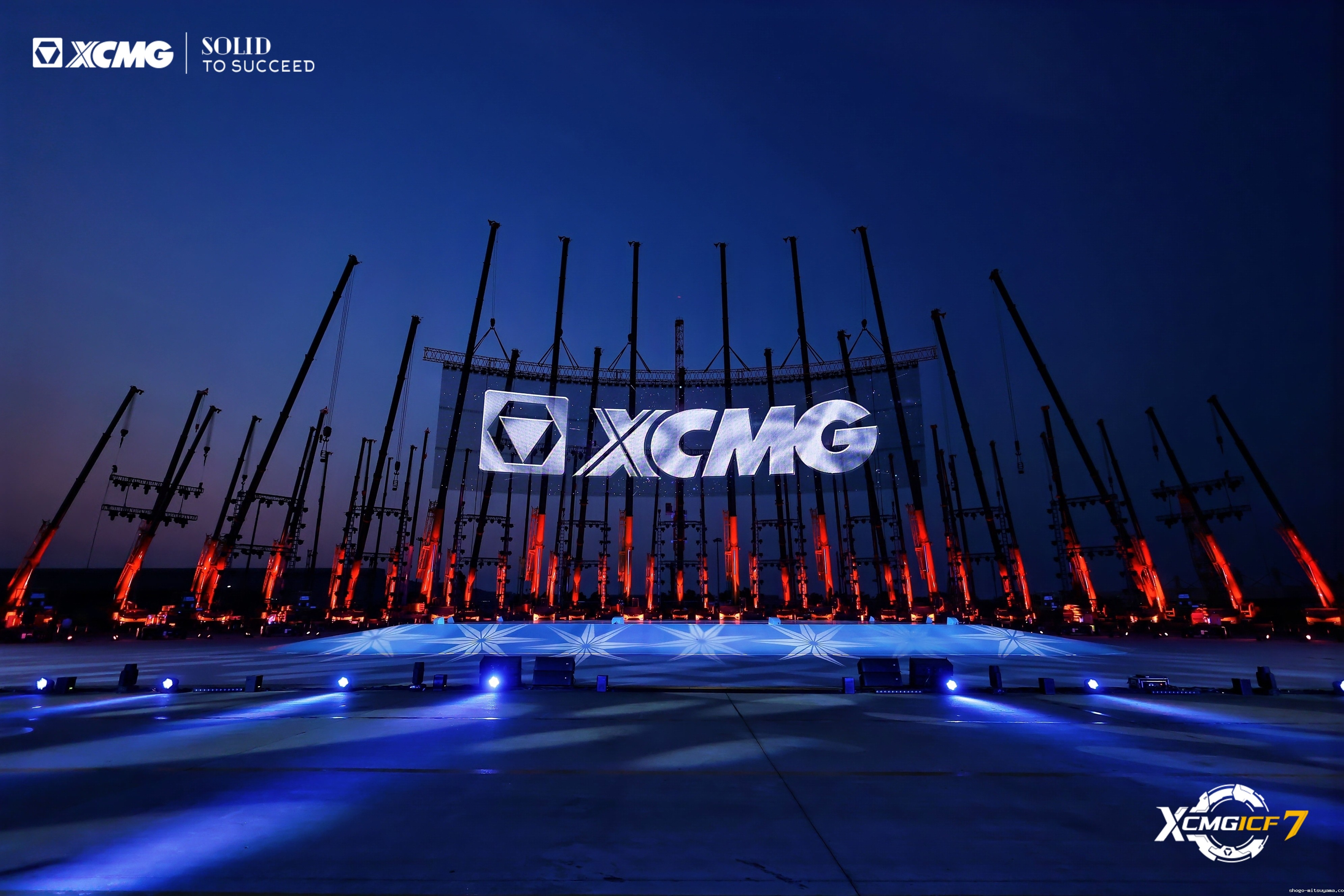 开幕式现场,《徐工产品灯光秀》率先登场,轮式、履带、塔式、随车等近80台全品类起重机械轮番展示。其中,6台G2代130吨轮式起重机吊起长60米、宽15米、重7吨的弧型大屏,起重机臂架化作光剑划破夜幕,全场2500盏彩灯交相闪烁,徐工八十二载征程在光幕中奔涌流淌。