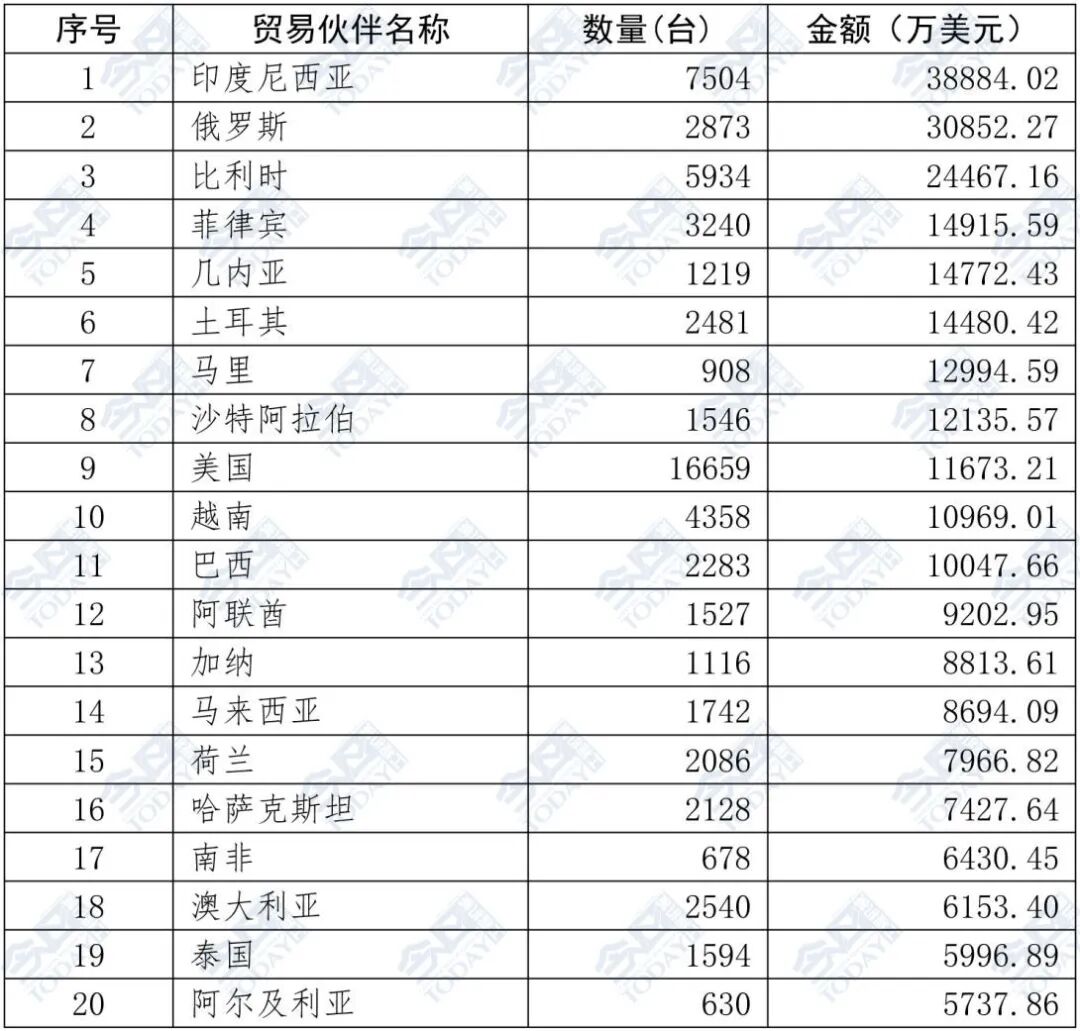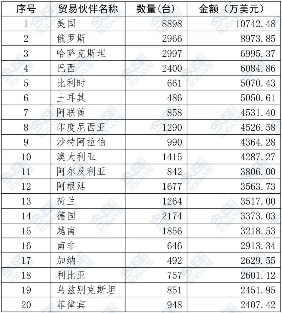 对美国、俄罗斯和哈萨克斯坦出口位列前三。其次依次为巴西、比利时、土耳其、阿联酋、印度尼西亚、沙特阿拉伯、澳大利亚位列前十。2025年5月装载机出口额排名前二十位国家和地区具体情况如表3所示。
