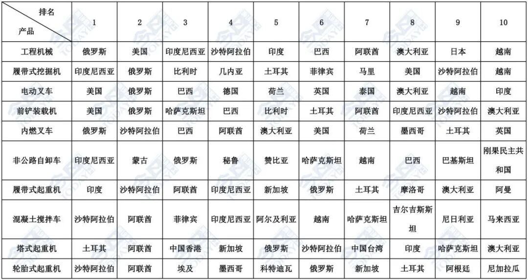 表1 2025年1-5月主要工程机械产品出口金额排名前十位国家和地区