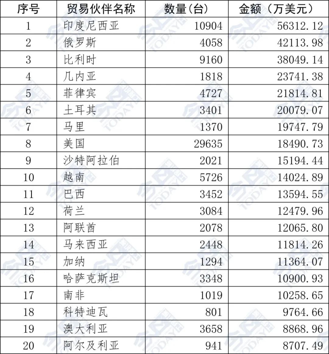 表2 2025年1—7月挖掘机出口额排名前二十位国家和地区