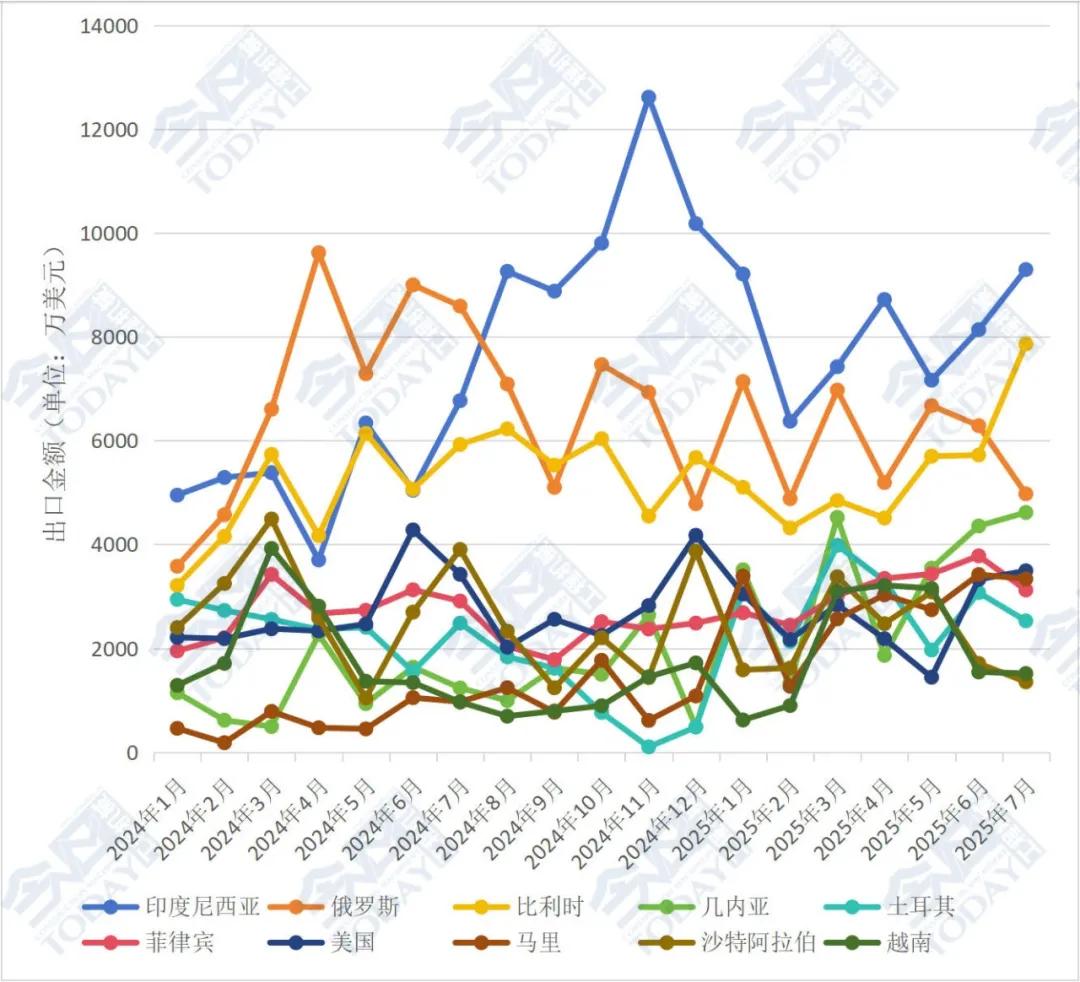 从2025年1—7月主要工程机械产品进出口贸易情况来看,对俄罗斯、美国、印度尼西亚出口金额排名位列前三,其次为巴西、沙特阿拉伯、印度、阿联酋、澳大利亚、日本、越南。相较2025年1—6月的排名,巴西上升至第四。澳大利亚上升至第八,沙特阿拉伯下降至第五,日本下降至第九。