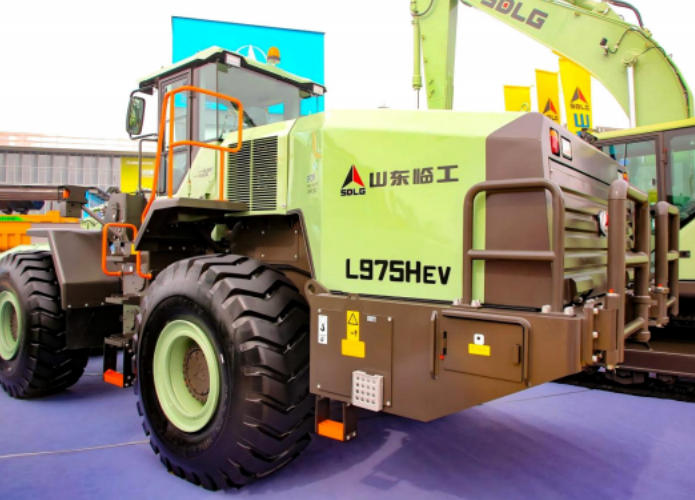 山东临工 L975HEV 侧卸装载机额定载重量 7800kg,整 机工作质量 28400kg,斗容量 4.2m³。采用三电机四输出动力系统、临工自主电控系统,性 能匹配合理、整机操纵舒适、工作效率高;配置 423kW ·h 电池系统,密封电池设计,防水防尘效果好。电池、电 机、电控配置热管理系统,可满足高低温和各工况的使用 需求,保证系统的安全性和稳定性:配置高速电机,体积 小重量轻、功率密度高,整机节能、高效。配置临工自制 EHT220 变速箱,加强型驱动桥、加强型传动轴,更加适 合重载工况。采用临工 H 代外观,全新升级驾驶室内饰和布局,空 间大、视野好,配备冷藏箱,冷暖空调,驾乘舒适。标配 自动润滑系统, 实现定时、定点、定量润滑, 智能化维护。采用电动后翻机罩,维护保养便捷、可靠。