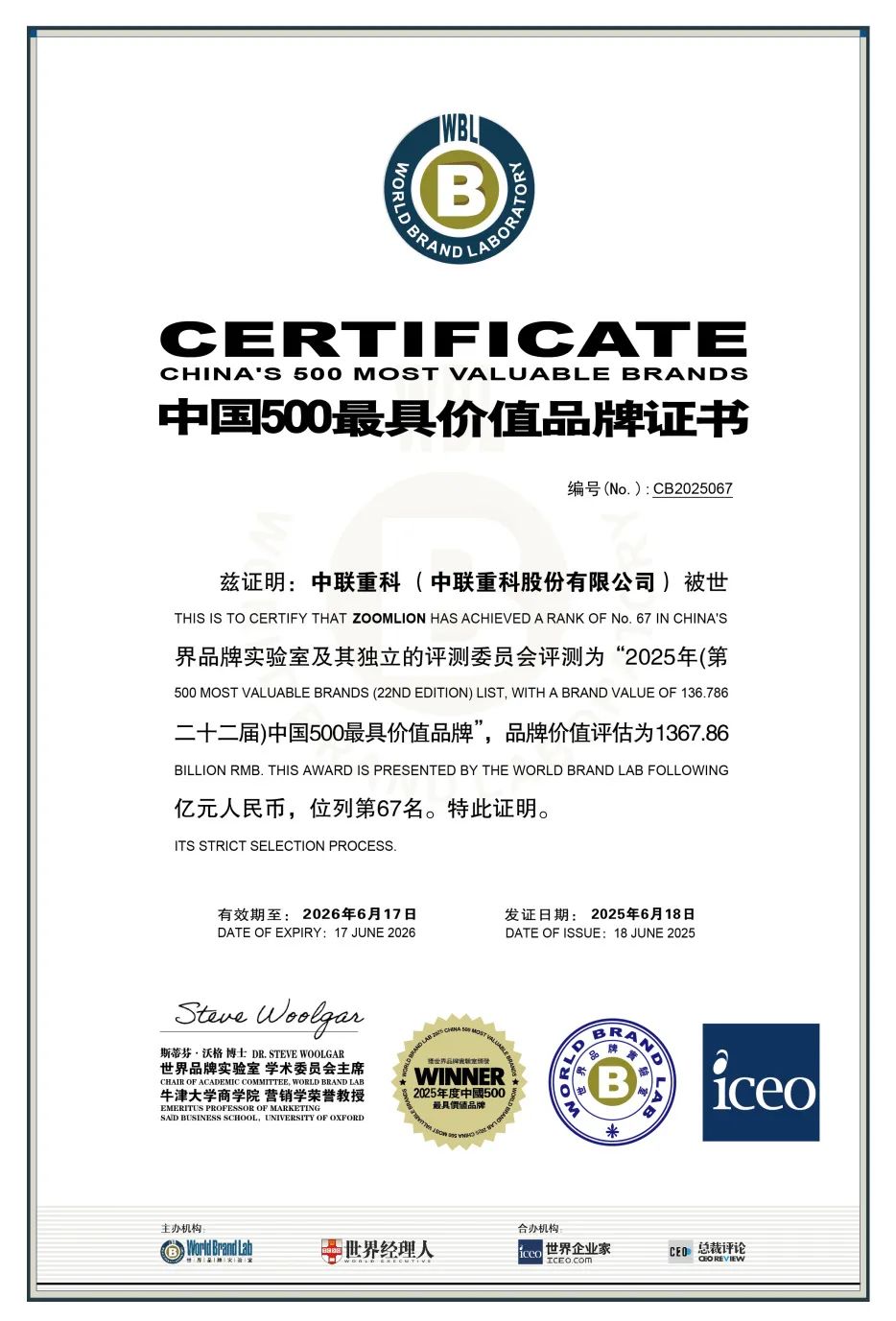 6月18日,由世界品牌实验室(World Brand Lab)主办的第22届世界品牌大会在北京举行,会上发布了2025年《中国500最具价值品牌》分析报告,中联重科以1367.86亿元品牌价值登榜,在去年基础上再次提升111.15亿元,稳健高质量发展成效显著。