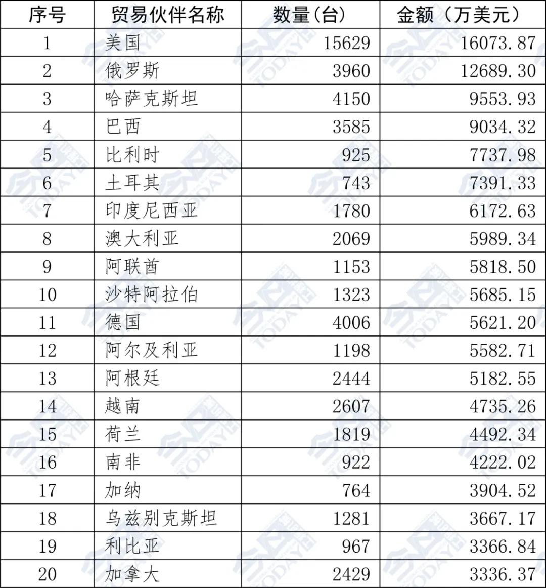表2 2025年1—7月挖掘机出口额排名前二十位国家和地区