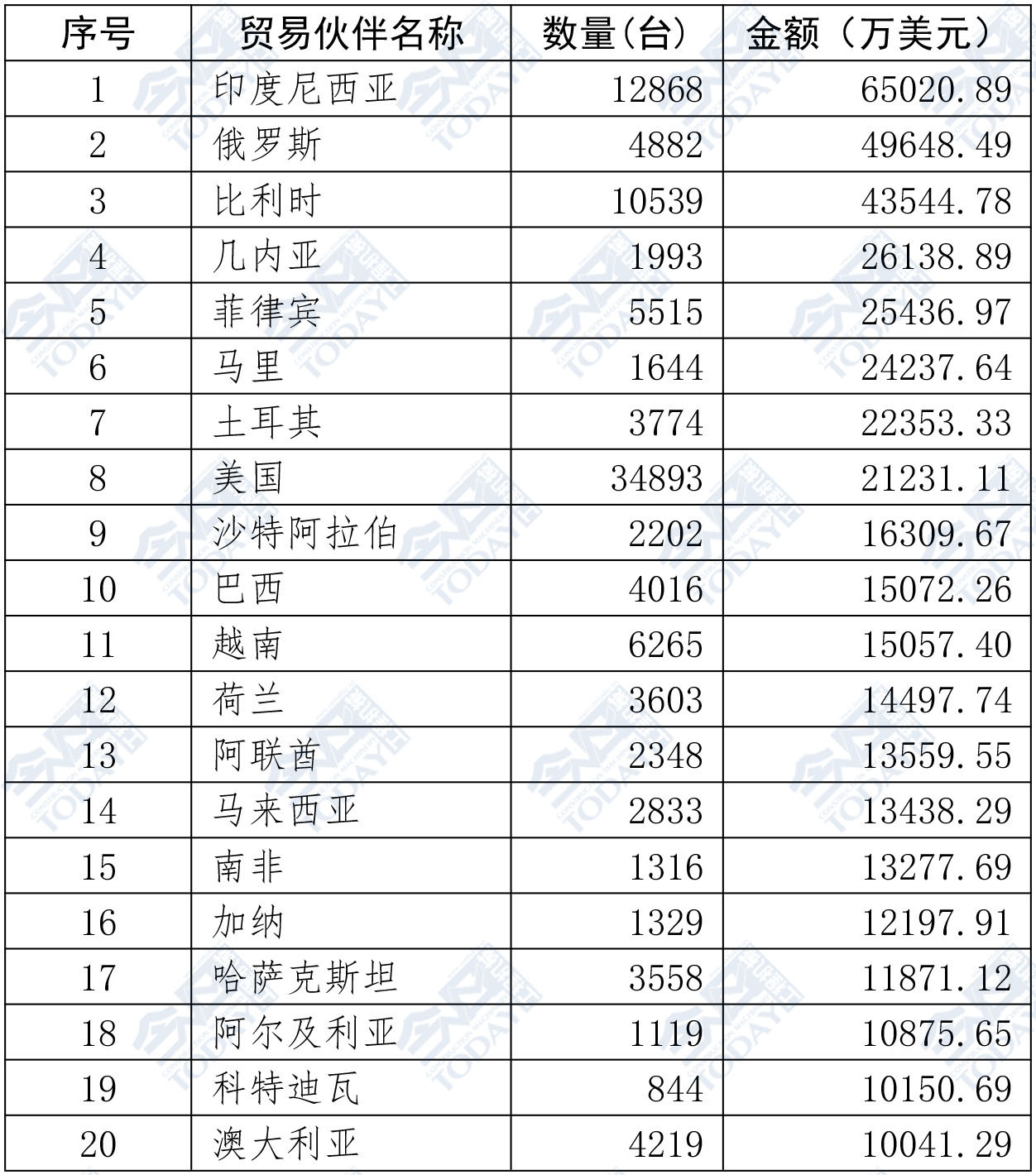 表2 2025年1—8月挖掘机出口额排名前二十位国家和地区
